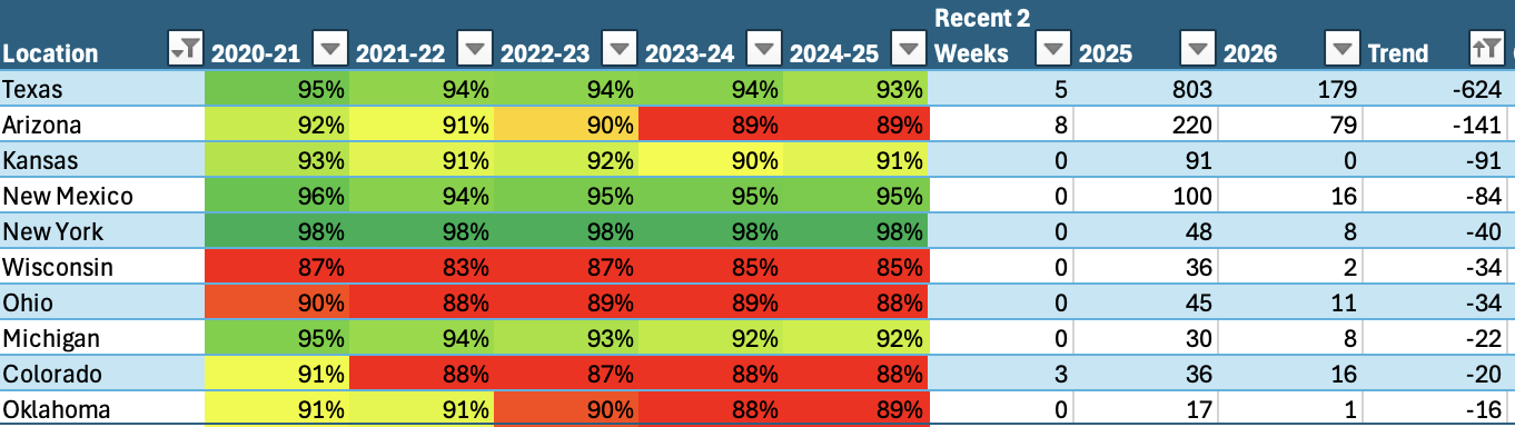 Some states, like Texas and Arizona, show fewer cases in 2026 compared to 2025.