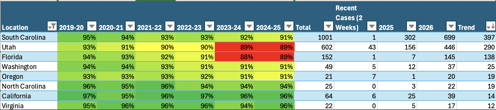 Even states maintaining ≥95% vaccination rates are showing concerning trends.